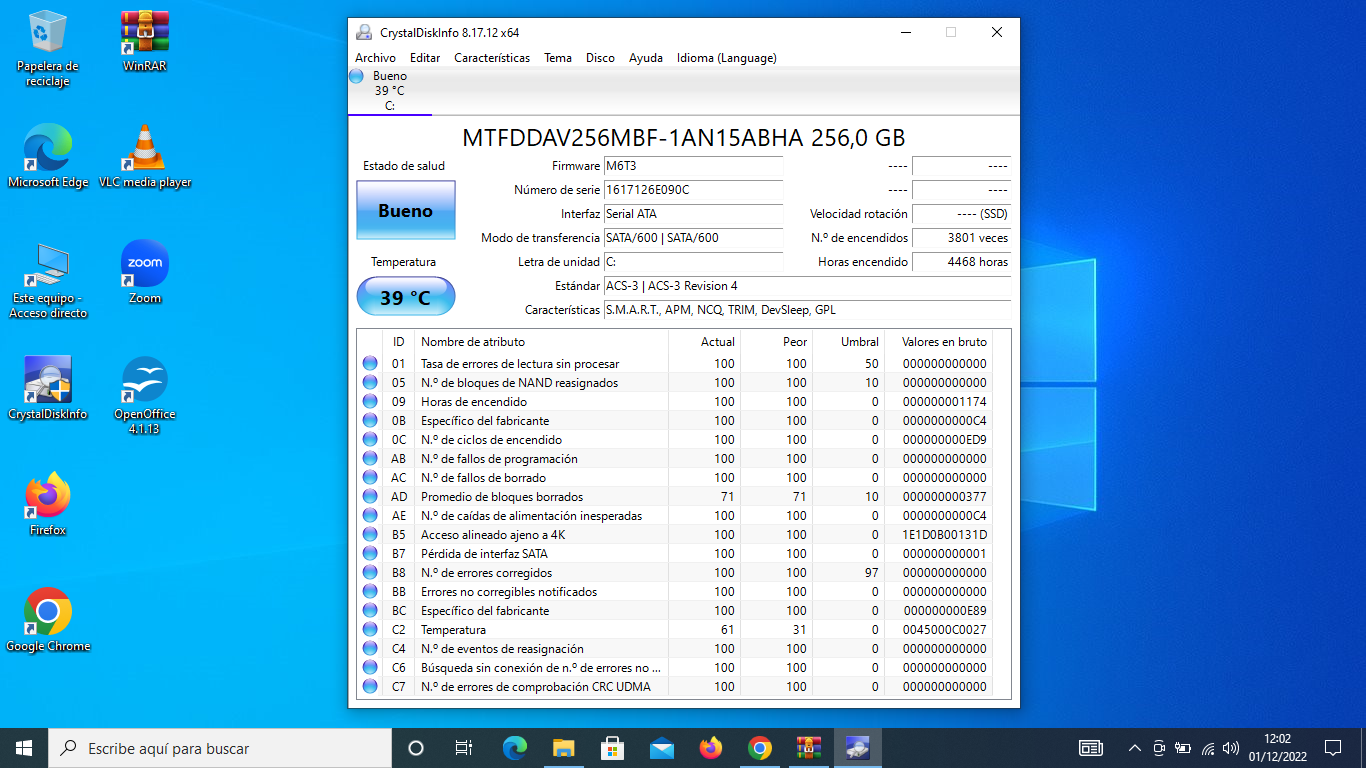 Observa como en un minuto tendrás el resultado del test CrystalDiskInfo, podrás comprobar si tienes el Disco duro dañado, ya que te indicará el estado de salud, la temperatura, las veces que se ha encendido y las horas de uso.
