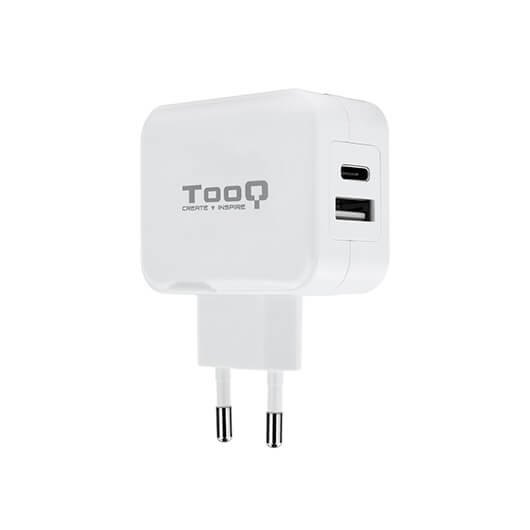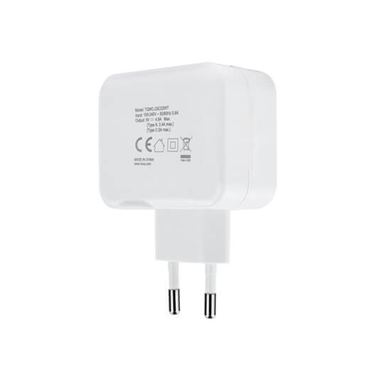 Cargador de Pared con doble puerto USB-C y un USB A, 27W. Carga simultáneamente dos dispositivos USB A y USB-C gracias a la salida de 27W.